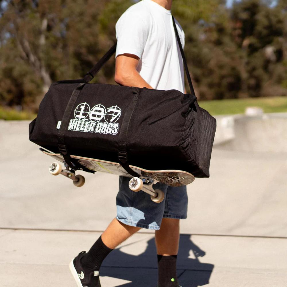 - "Haul your full arsenal of skateboards and gear with this oversized duffel bag. Purpose-built to withstand the all the abuse of daily sessions and long-distance travel. Two mesh ventilation panels allow your stuff to air out. Includes rugged shoulder strap and carry handles. Strap your skateboard to the bottom to wheel it around when it’s really loaded up.FEATURES