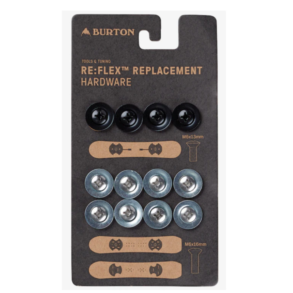 A full set of hardware for mounting Burton Re:Flex bindings to either The Channel®, 3D, or 4x4 snowboarding mounting patterns. Includes eight silver M6x16 sCrewnecks and washers for 3D and 4x4 mounts as well as four black M6x13 sCrewnecks and washers for The Channel mounting system. Don't sCrewneck with random collections; use the correct hardware to ensure a proper mount