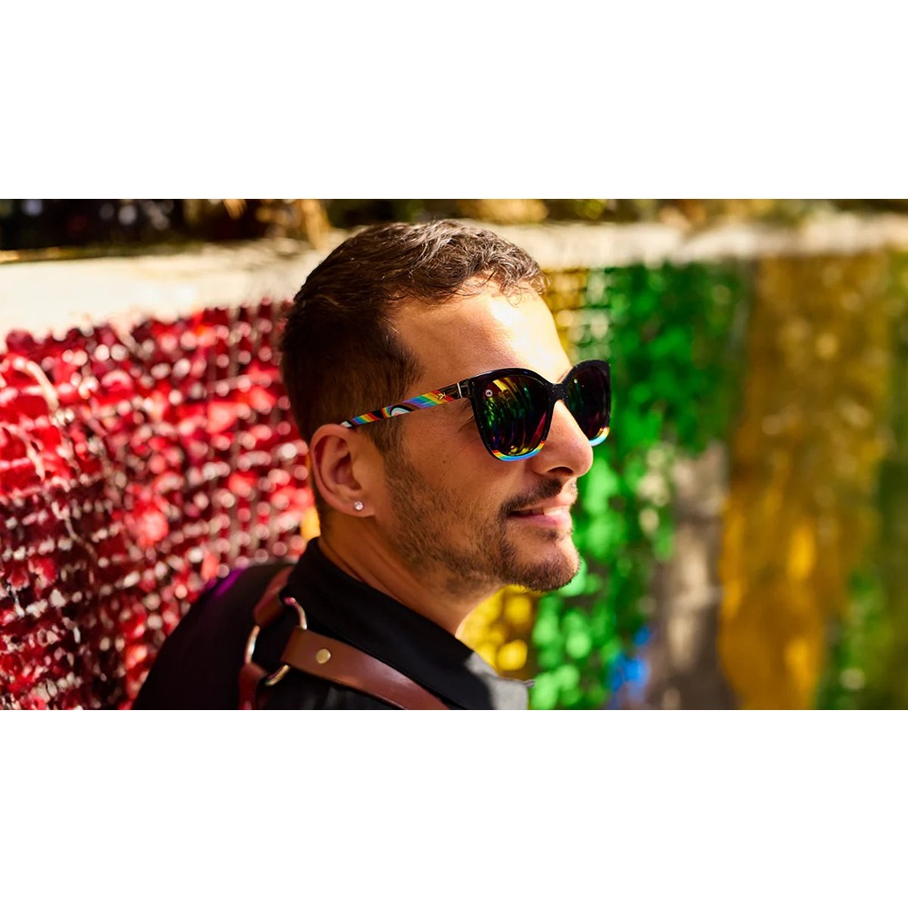 The Rainbow On My Parade Deja Views double down on colorful expression! A clean-cut glossy black front is accented by rainbow stripes at the bottom, while a Progress Pride Flag-inspired swirl enthusiastically paints each arm in full color. Polarized rainbow lenses and silver K-logos finish this pair for a look that’s just as full of fun as you are.