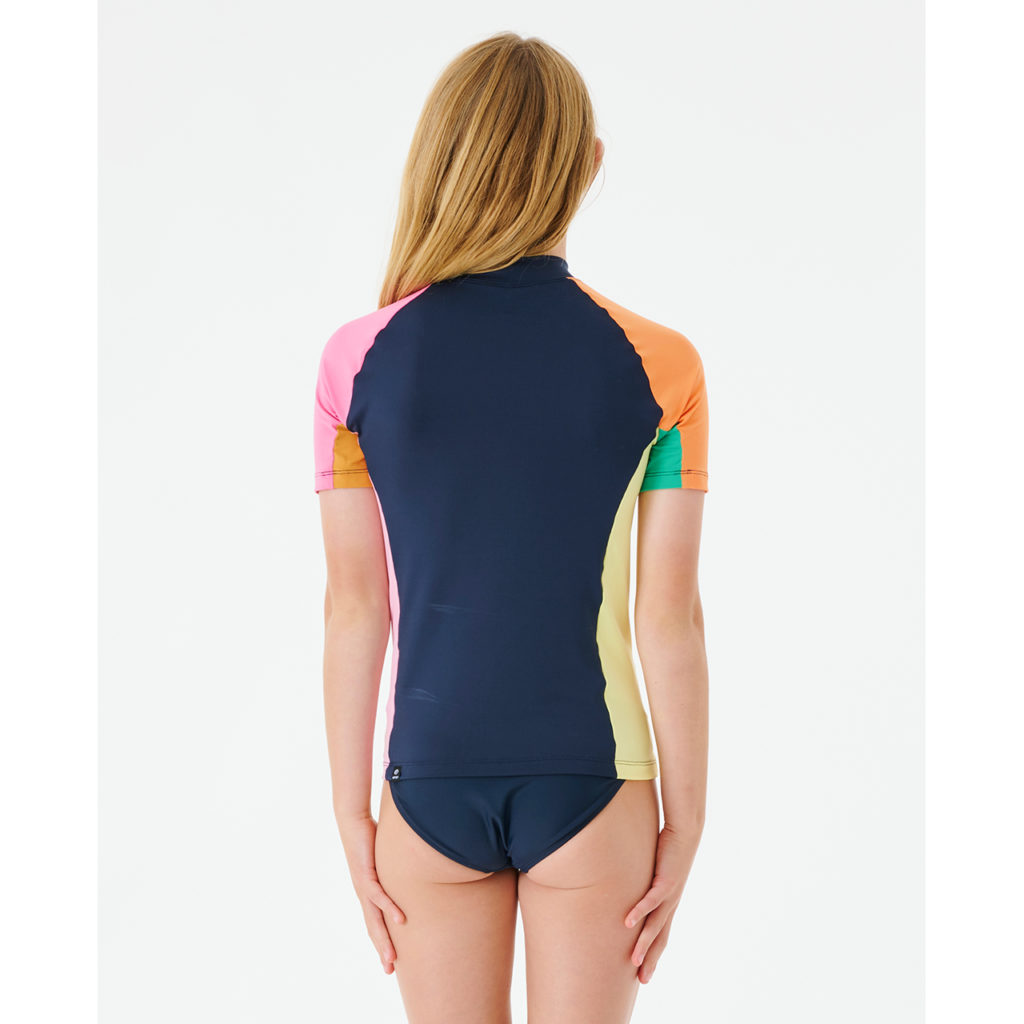 The Daybreak Short Sleeve Rash Vest is a bright and fun girl's pullover rash guard. Made from Extra Life Microfibre Lycra that gives long-lasting comfort, fit and shape with no bagging or sagging, in a performance fit with contour panelling for reduced drag and promotes ease of movement in the water. Providing excellent UPF50+ UV Sun Protection factor.