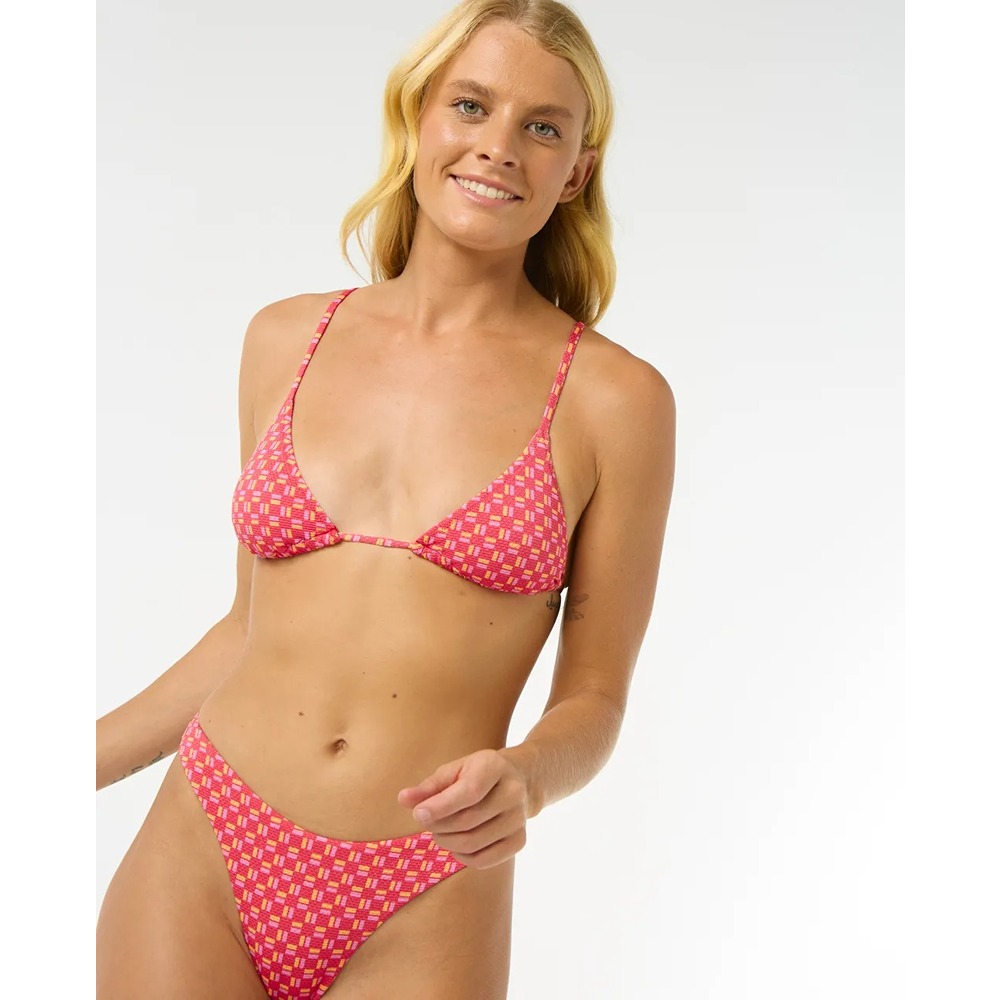 This bikini top provides light support with a sliding triangle design, made from Lurex Pique fabric (85 % Polyamide, 12 % Elastane, 3 % Metallic). It features an all-over yardage print, removable padding, fully lined construction, adjustable straps, and a metal logo trim.