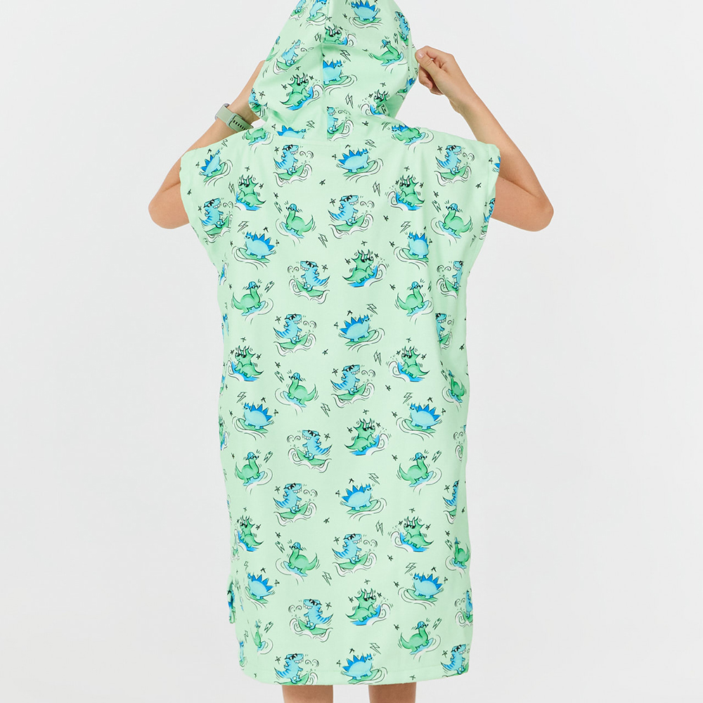 - The large hood ensures quick drying of the head and hair, and the 100% polyester exterior features a cartoon-style dinosaur print on a bright green background, giving a playful look that kids love. Practical, comfortable, and stylish, this poncho towel is the perfect accessory for swimming trips or post-bath moments at home!