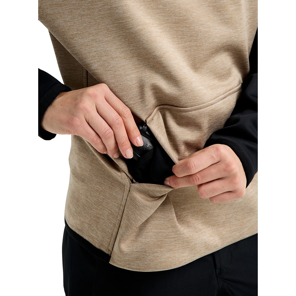 Riding all day in your cotton hoodie sounded like a good idea until you started getting wet and cold. Well, the women's Burton Crown Weatherproof Pullover Fleece is techy enough for mountain days and laid-back enough for chilling in town. It's the answer to riding all day in a sweatshirt. Pull up the hood and consider yourself ready for just about anything.