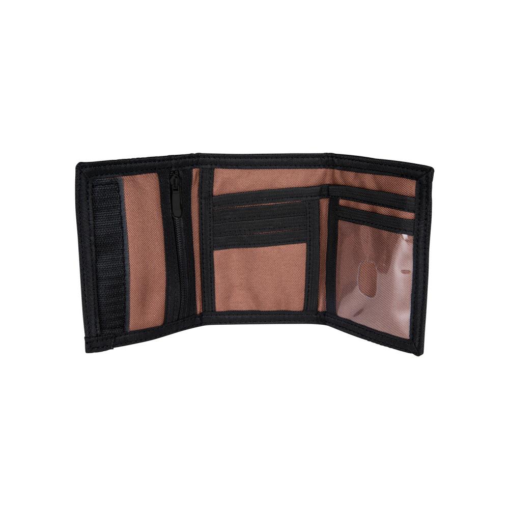 - 100% polyester, canvas tri-fold wallet, inside zip coin pocket, card and note slots with ID window and front print