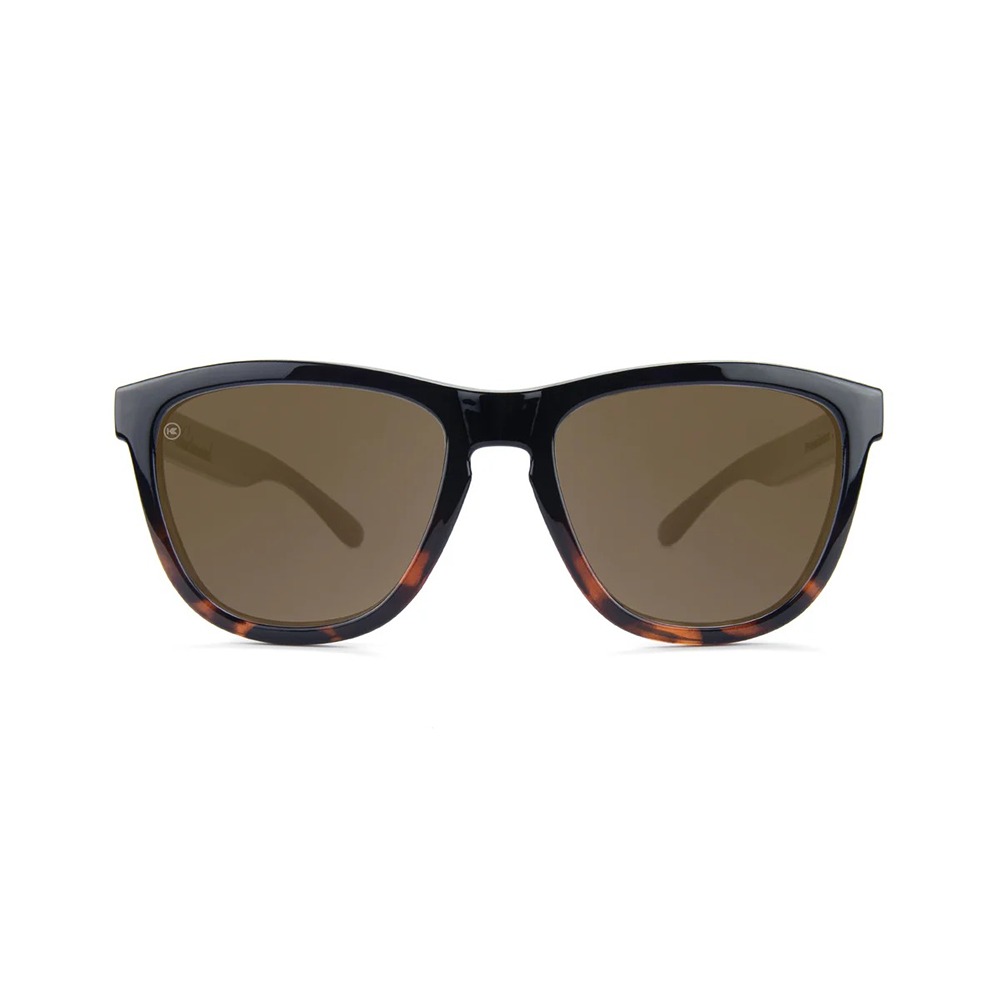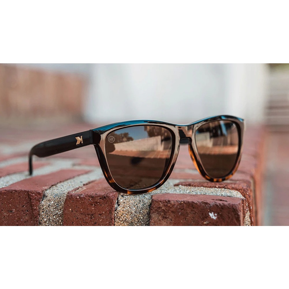If you can’t decide between modern and classic, bold and relaxed, then why not get it all? These polarized glossy black and tortoise shell sunglasses have everything you could want for style and eye protection. The lightweight polycarbonate frames provide a comfortable and accommodating fit while the polarized amber lenses help shield your eyes from the harsh glare of the sun. These timeless sunglasses are finished off with gold K logos on each arm.