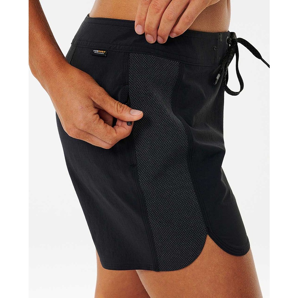 - Embrace style and performance with the Women's 3/2/One Mirage Boardshort. Made from stretch Cordura fabric, these standard fit boardshorts offer durability and comfort. The DWR water repellent treatment ensures quick-drying properties, while the engineered sublimation print adds a trendy touch. With a hidden high hip zip pocket and high density heat transfer logos, these boardshorts are perfect for your water adventures.