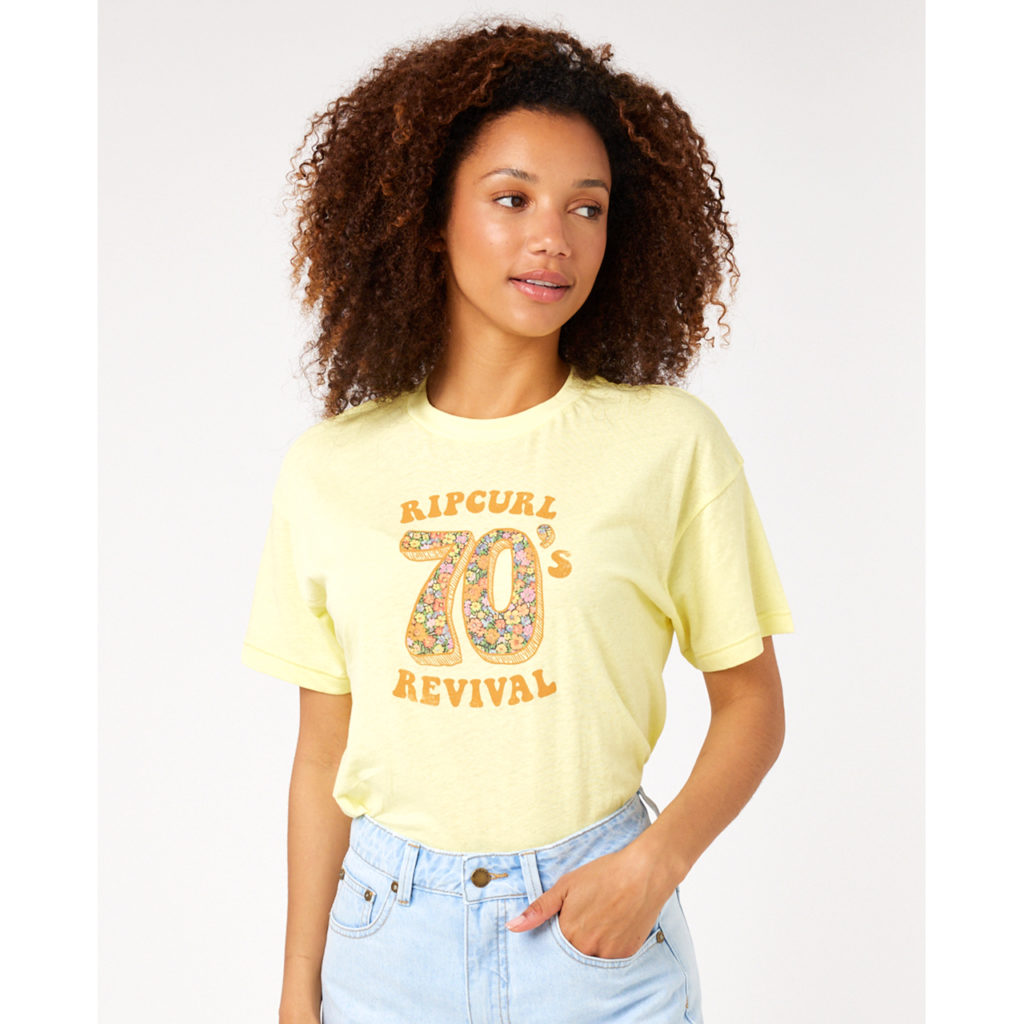 The Afterglow cotton jersey t-shirt comes from Rip Curl’s women’s collection. It has a vintage look with its 70s print on the front. We love all three of its colours: ecru, mint and yellow!