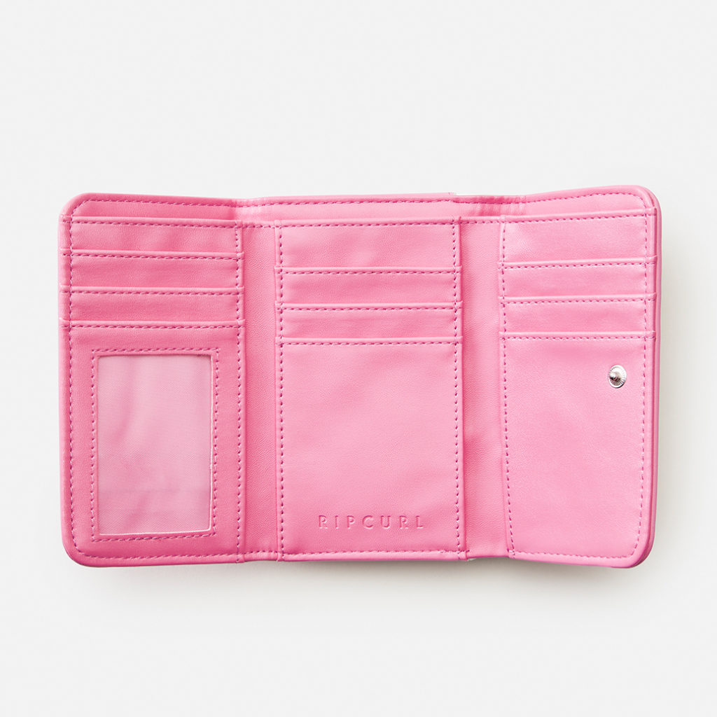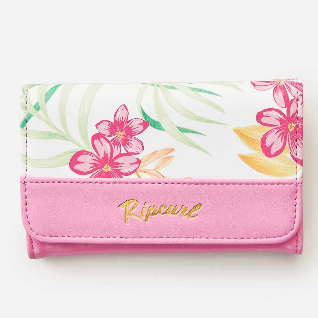 The Mid Wallet Yardage is a bright and fun clutch wallet, made from PU faux leather, with floral and pink panels, metal snap closure, ID window, and multiple card and coin slots.